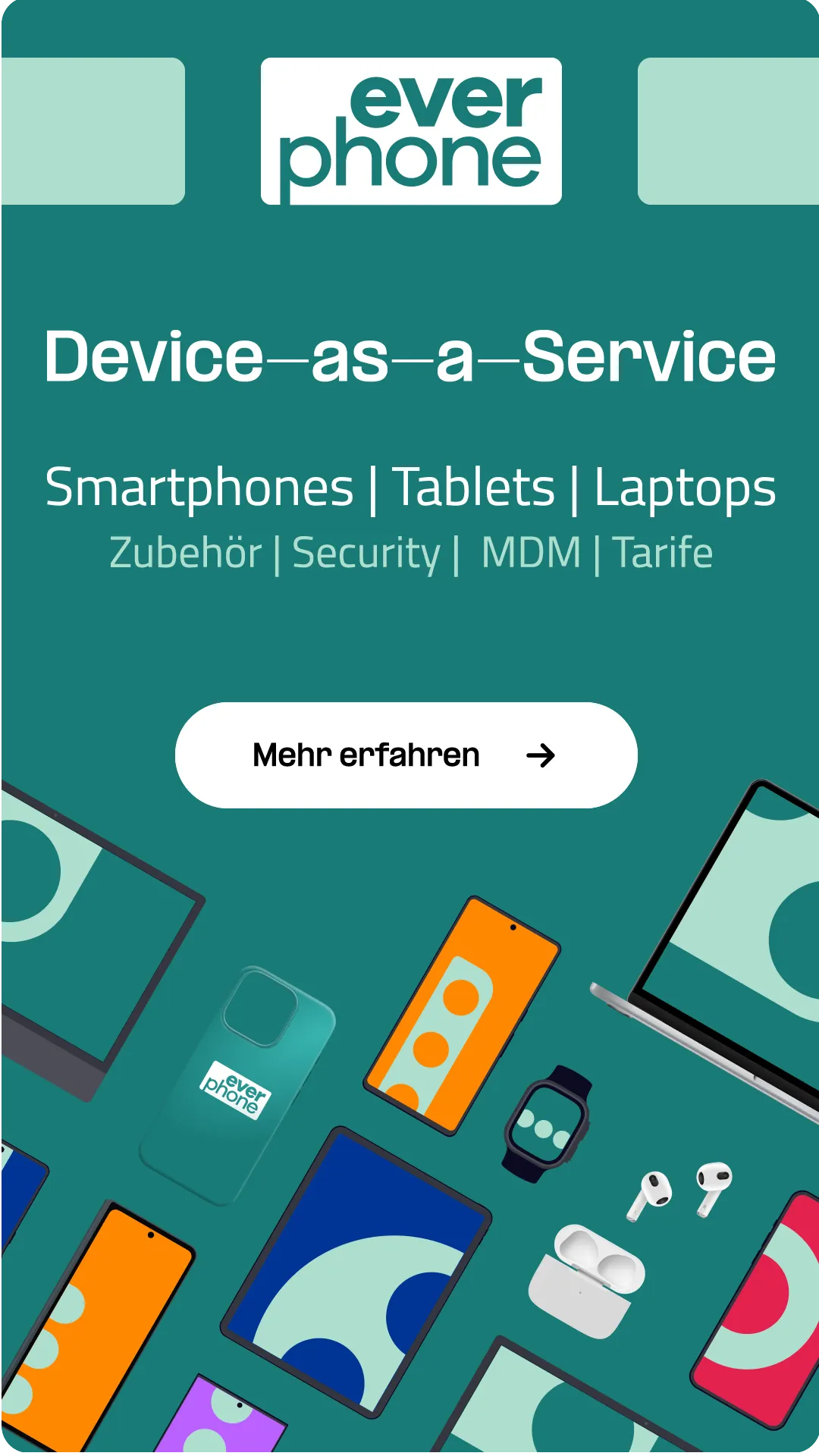 Everphone ist die Device-as-a-Service-Plattform für Smartphones, Tablets und Laptops im Unternehmenskontext. Als führender DaaS-Anbieter übernimmt Everphone Beschaffung, Konfiguration, Verwaltung, Sicherheit und Austausch der Geräte für mittlere und große Organisationen. DaaS zentralisiert das Gerätehandling, minimiert Ausfallzeiten und verbessert die Nutzererfahrung; zudem profitieren Mitarbeiter*innen mit „Choose-your-own-Device“ von einer freien Gerätewahl. Bestandsgeräte und Geräteflotten lassen sich mittels des „Buy-and-rent-back“-Mietrückkaufs (BARB) unterbrechungsfrei zu DaaS migrieren.